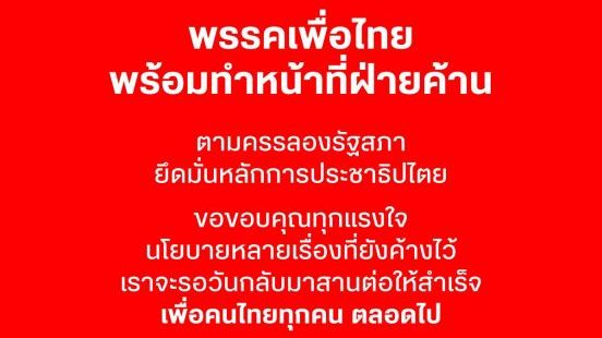 为泰党在第32任首相选举尘埃落定后发表声明,确认将会遵照议会程序担任反对党,并誓言将会卷土重来,继续完成众多未来得及实施的政策,以造福全体泰国人民。